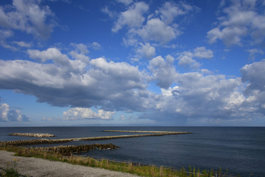 佐渡ヶ島の小佐渡側がハッキリと見えています。大佐渡側は雨に隠れています。