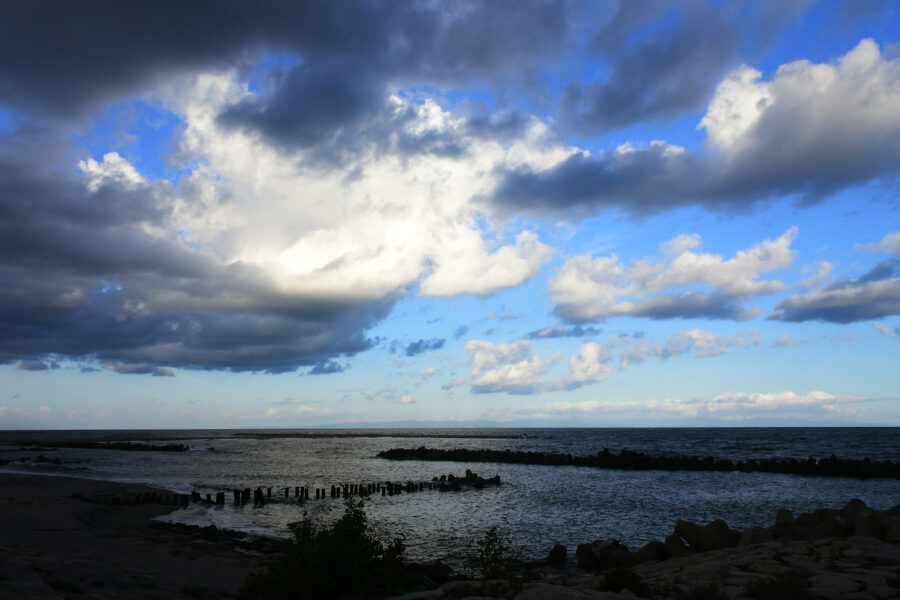 海岸に着いてもこんな状態、暗い海面が広がっています。