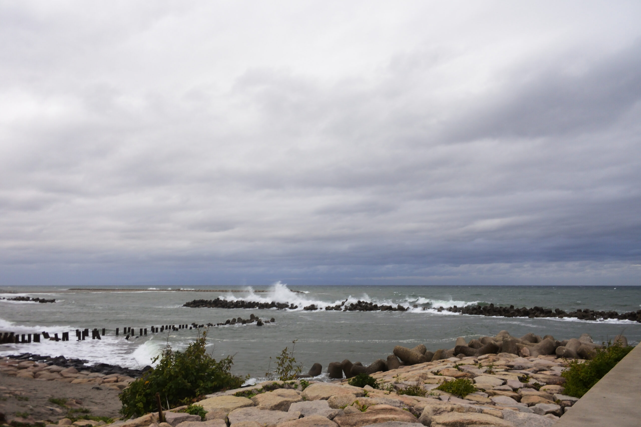風は海岸線とほぼ平行に吹いているので飛沫は飛んできません。