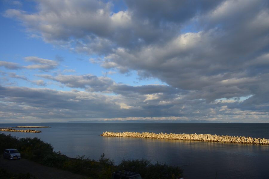 雲と同じ色の佐渡ヶ島が見えています。寒いです。