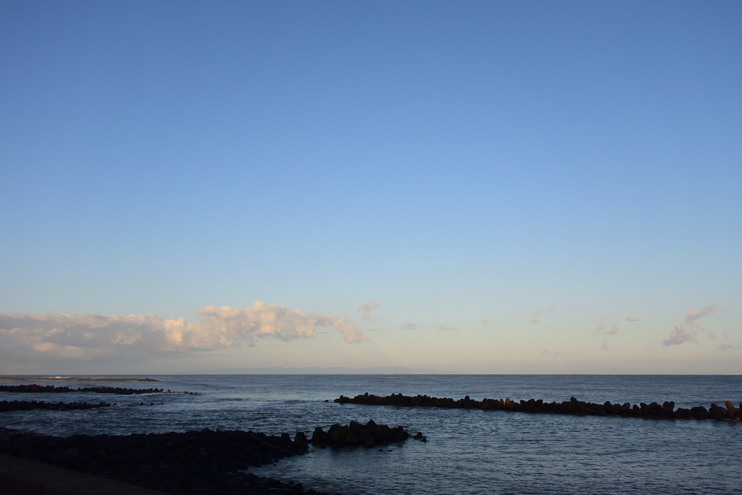 寒いですけど穏やかな方です。ぼんやりと佐渡ヶ島が見えています。