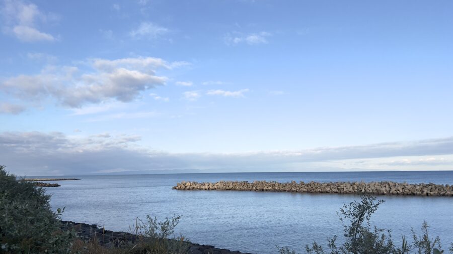 弱い南風が吹いています。割とハッキリと佐渡ヶ島が見えています。