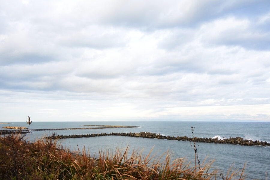 草むらがすっかり茶色です。雲の中に、微かに、佐渡ヶ島の稜線が見えました。