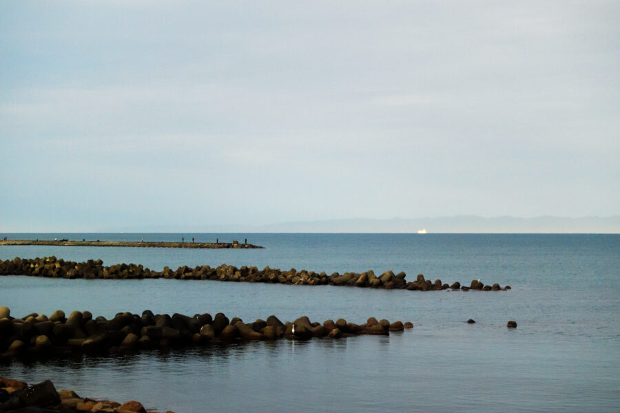 遠くの堤防に多くの釣り人。薄く佐渡ヶ島の影が見えています。