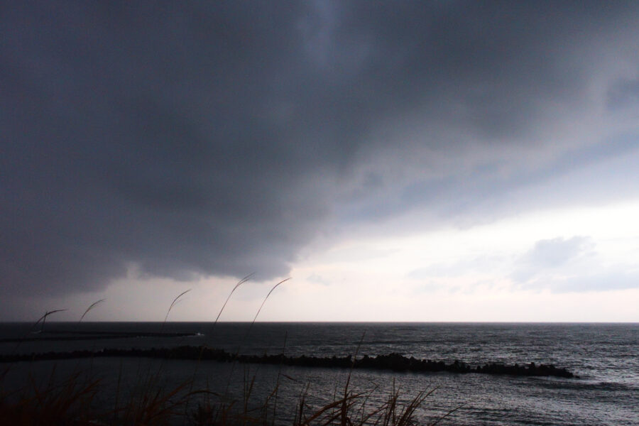 黒い雲が向かって来ます。遠くで雷の光。長居は無用ですね。