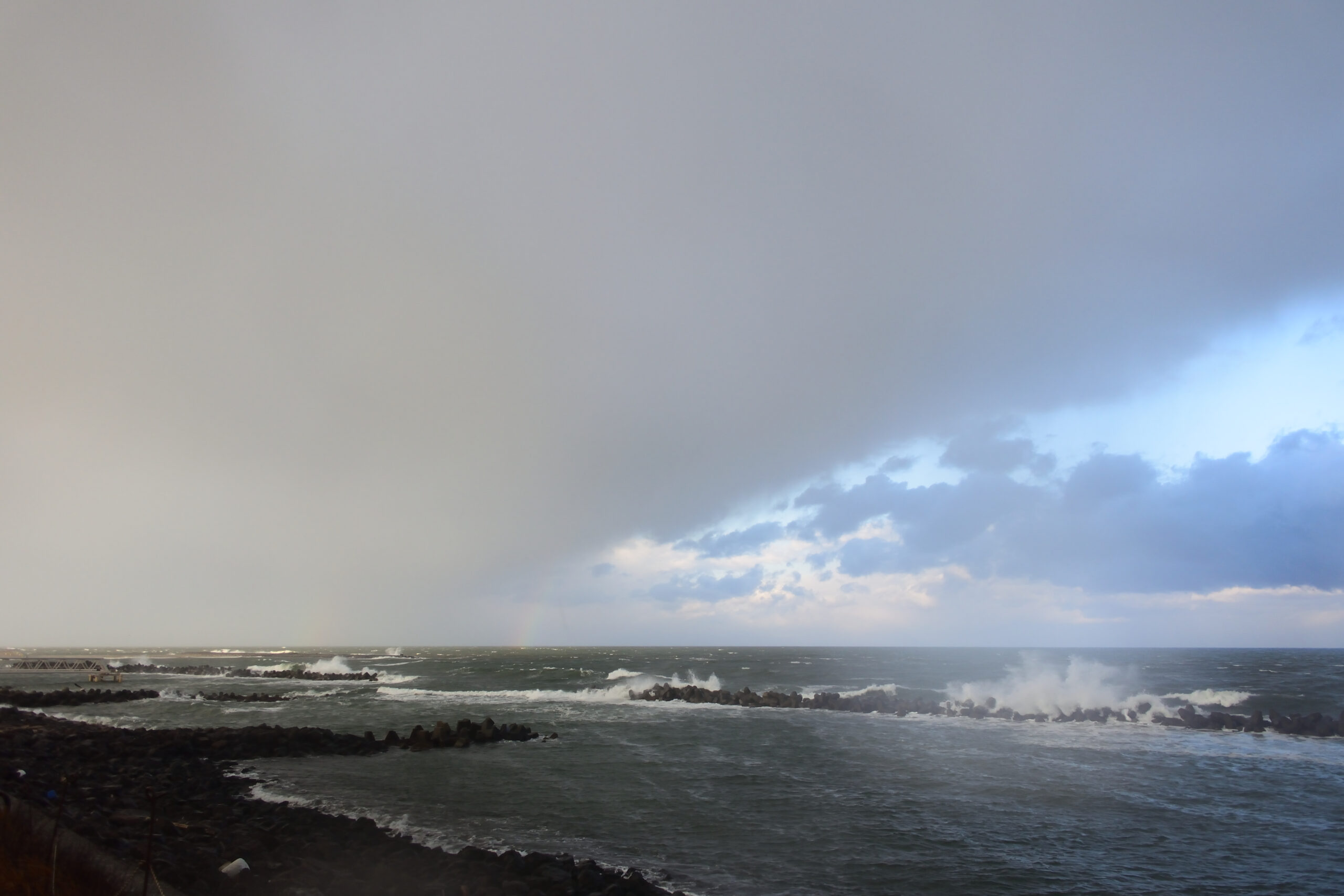 海岸に着いたら雨が海面と平行に飛んでくる強風です。