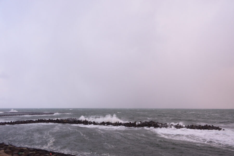 海岸に着いたら横殴りの西風。