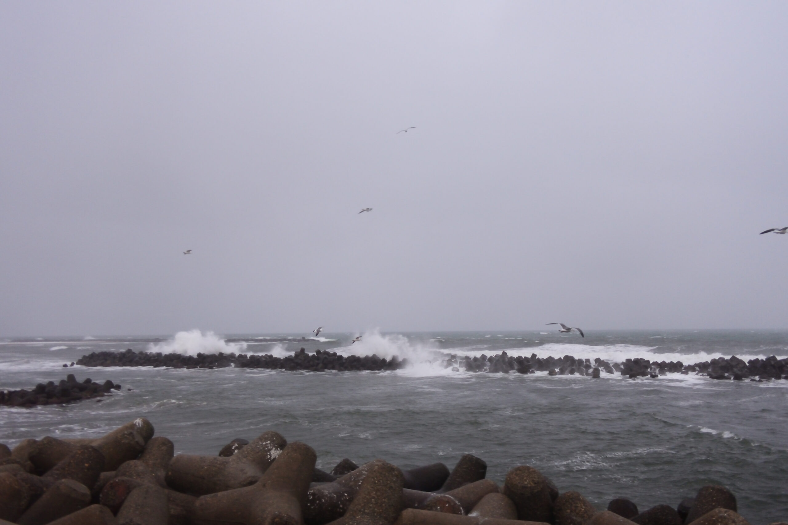 飛沫が風に乗って飛んできます。カモメたちは楽しそうです。