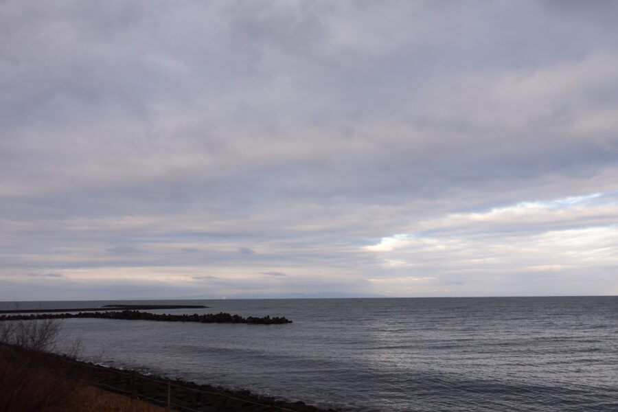 佐渡ヶ島が見えています。所々、雪が確認できます。