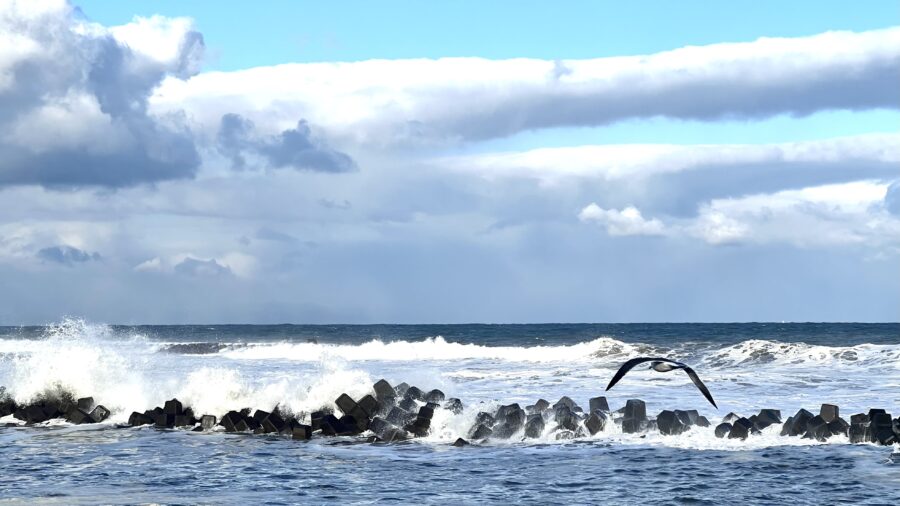カモメが10羽くらい飛行しています。速い、猛スピード。