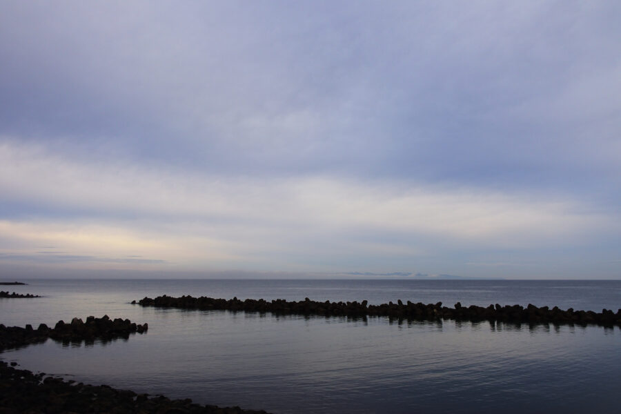 水平線に横たわる雲の上に大佐渡の一部が顔を出しました。