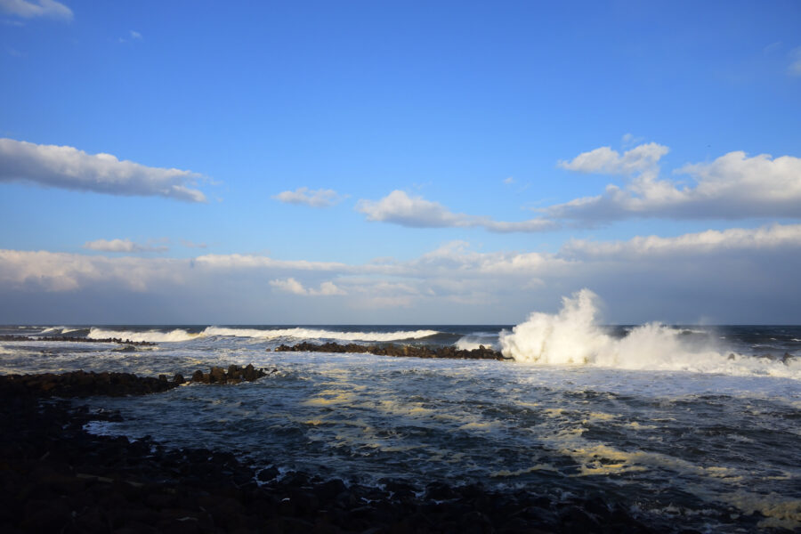 海岸に来たら高い波。沖から盛り上がった大きな波が次々に押し寄せます。