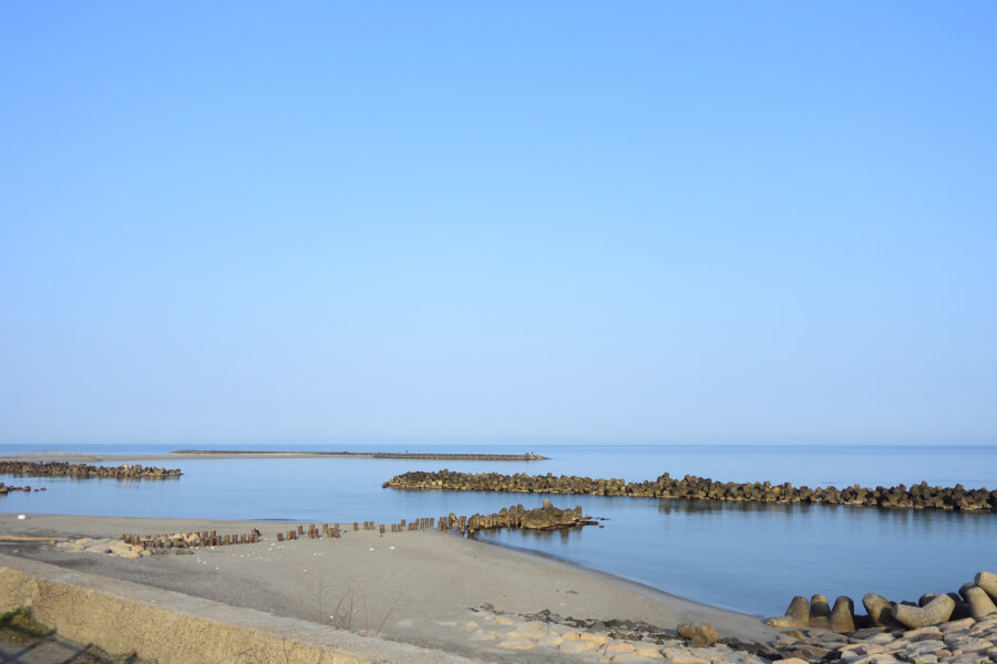 海岸は静か、波打ち際がほんの少しだけ動いています。