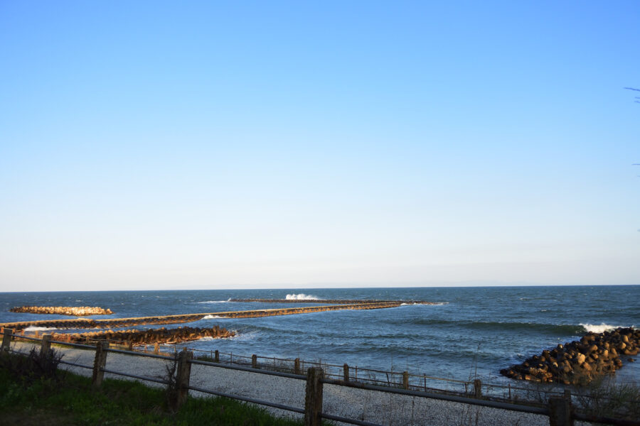 沖はぼんやりしています。微かに佐渡ヶ島の影が確認できました。