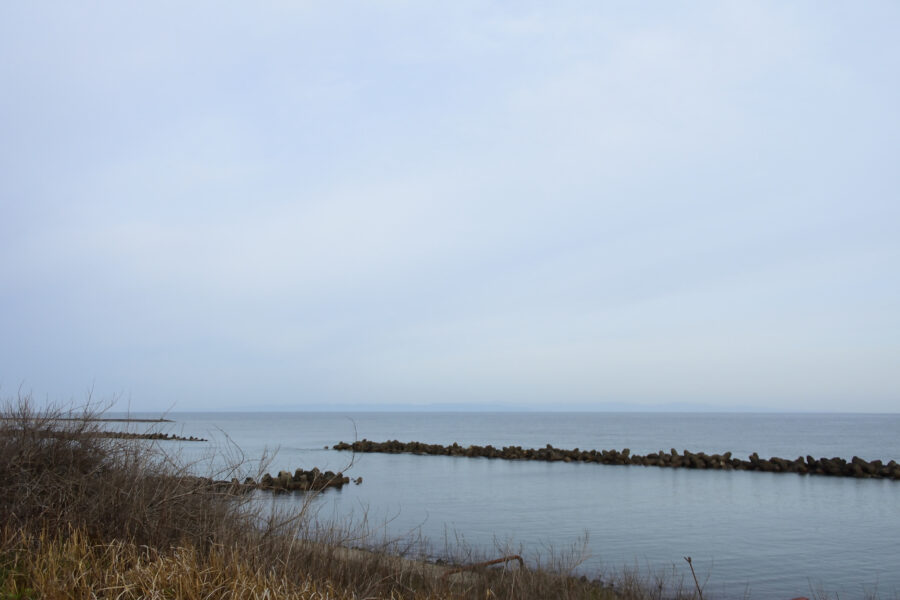 海もぼんやりです。佐渡ヶ島が見えています。消えてしまいそうです。